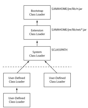 클래스 로더는 상위로 부터 순서대로 부트스트랩(Bootstrap), 확장(Extensions), 시스템(System) 클래스로더가 순서대로 올라간다. 즉, 동일한 클래스가 여러 곳에 존재할 때 로딩되는 우선순위는 Bootstrap>Extensions>System Class Loader가 된다. 부트스트랩 클래스 로더까지 확인해도 없으면 요청받은 클래스 로더가 파일 시스템(CLASSPATH 등 기준)에서 해당 클래스를 찾는다.